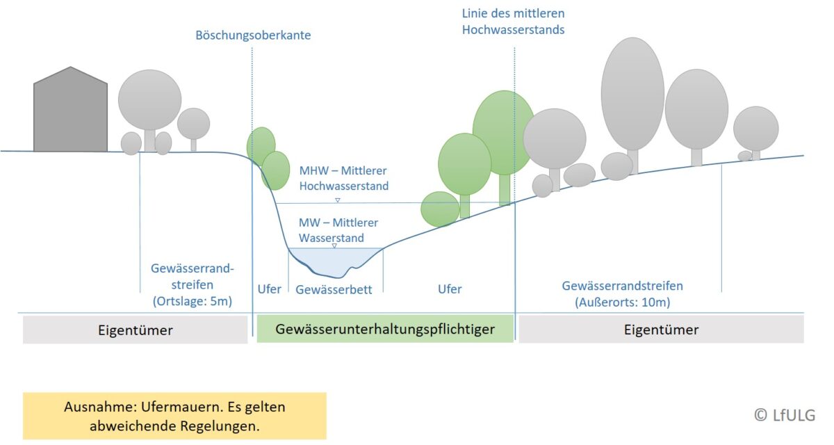 An das Ufer grenzt der Gewässerrandstreifen an. Da sich diese Flächen außerhalb des Ufers befinden, sind Gemeinde oder LTV auch nicht mehr zuständig. Hier liegt die Zuständigkeit zur Pflege und Entwicklung beim Flächeneigentümer. Ausnahmen sind Ufermauern, für die unterschiedliche Zuständigkeiten gelten können.